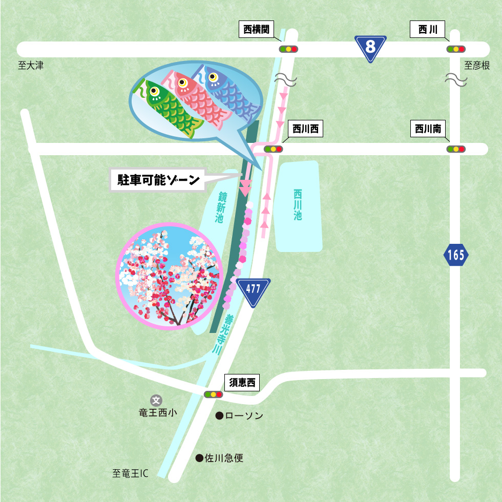 竜王インターから5分 国道477号沿い 滋賀県蒲生郡竜王町 西川西の信号辺り(鯉のぼりが目印です)